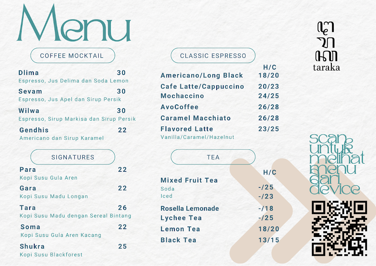 - Coffee Mocktails: For a refreshing twist, Taraka's coffee mocktails like the Dlima Espresso and Gendhis Americano are a must-try, delightfully priced at IDR 22,000 to IDR 30,000.